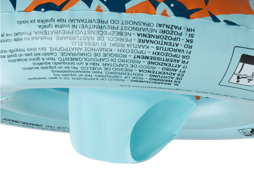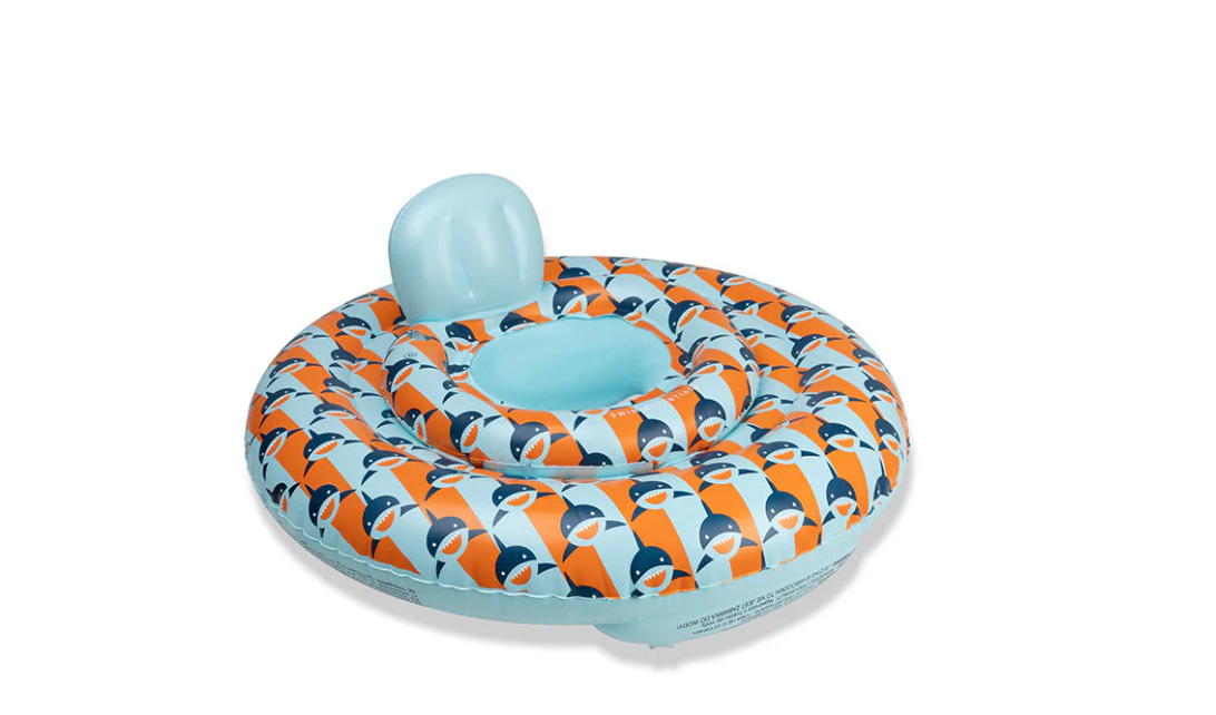 Laat jouw kleintje op een speelse en veilige manier kennismaken met water met deze vrolijke baby float in oranje en blauw design met haai.